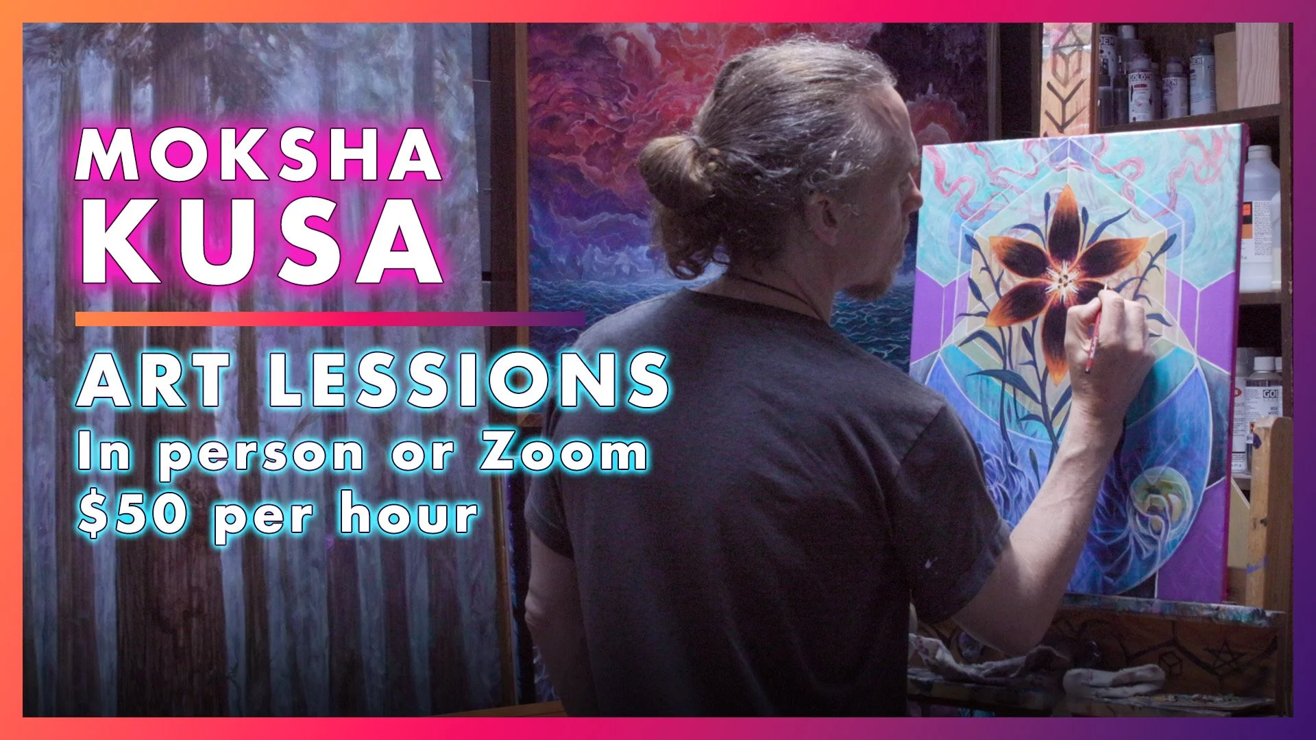 Learn to paint with Moksha, an artist of over three decades of experience in the professional art world. Individual students and groups are welcomed. There are also monthly drum making workshops. Click the image above.
