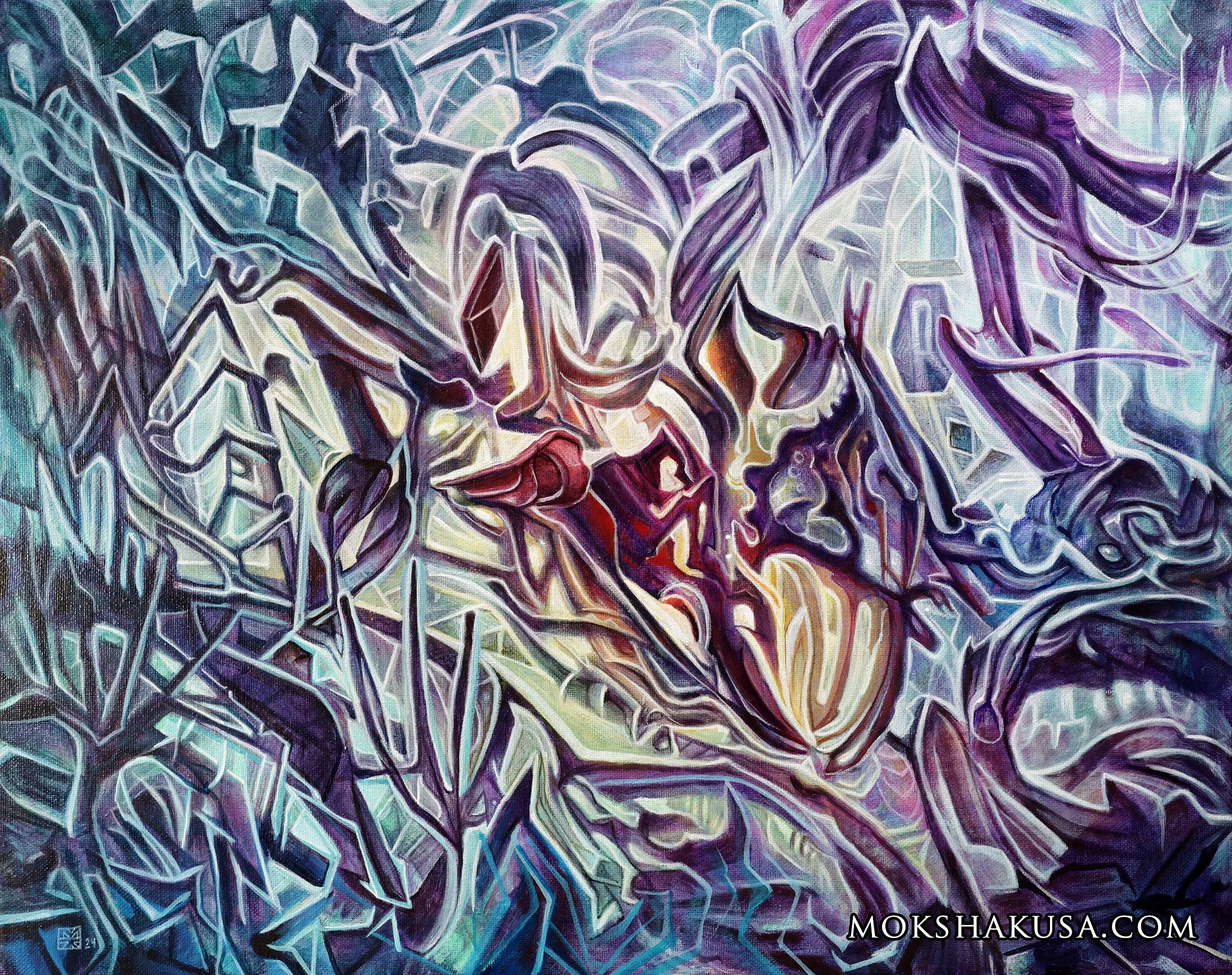 These abstract works are another mode of Moksha Marquardt's work where he is mostly exploring texture and various techniques of applying paint other than with a paintbrush. In many of them you can see bark texture which comes from is love of trees.